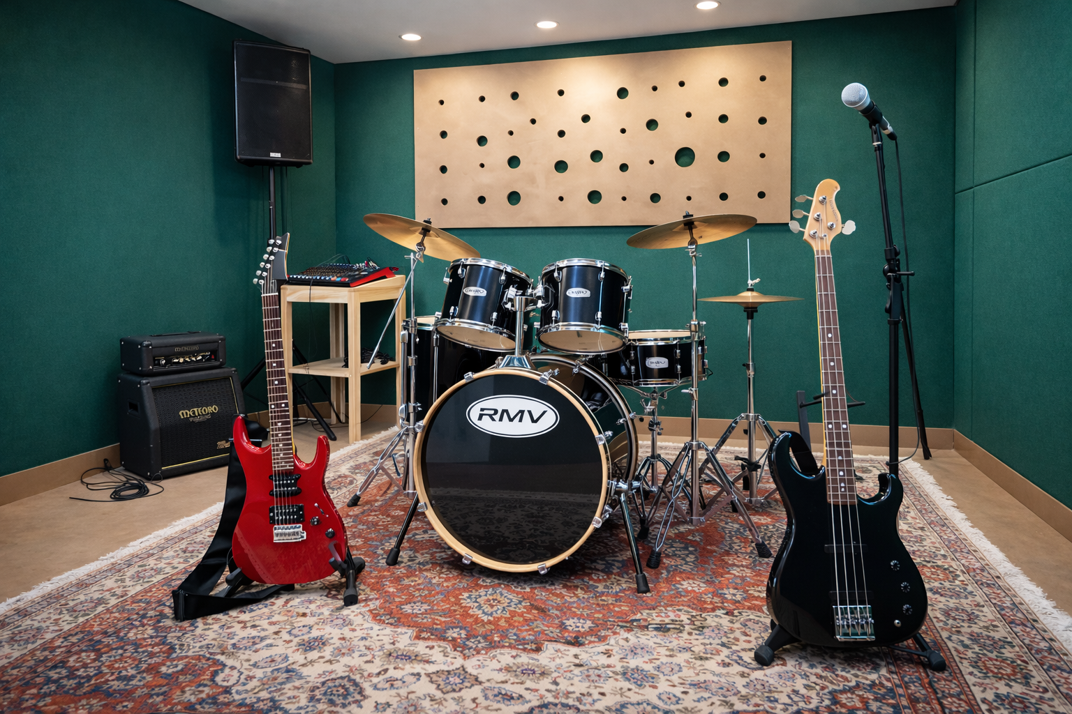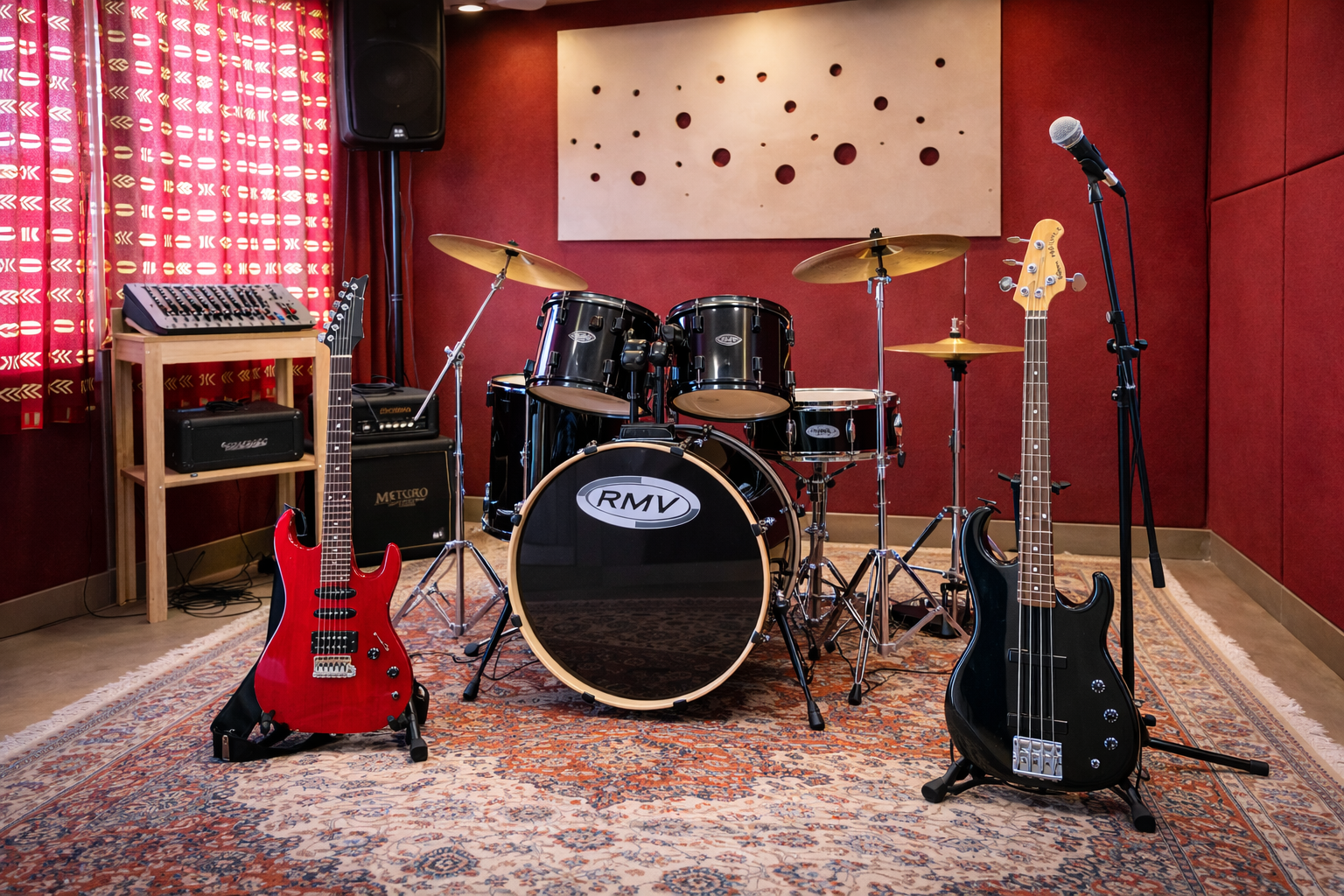 Salas com tratamento acústico, instrumentos profissionais, incluindo baterias, pratos, amplificadores de guitarra, baixo e teclado, microfones, retornos, PA’s e mesa de som. Tudo para criar um ambiente confortável que proporciona imersão, aprendizado e criatividade.